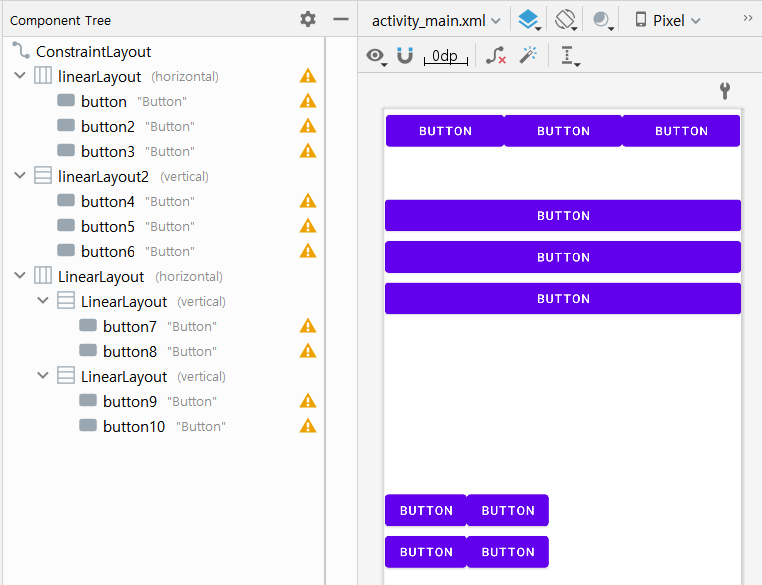 다르게 말하면 0dp로 설정할 경우, 위의 코드처럼 전체 공간을 원하는 대로 분할할 수 있다는 의미이기도 하다!