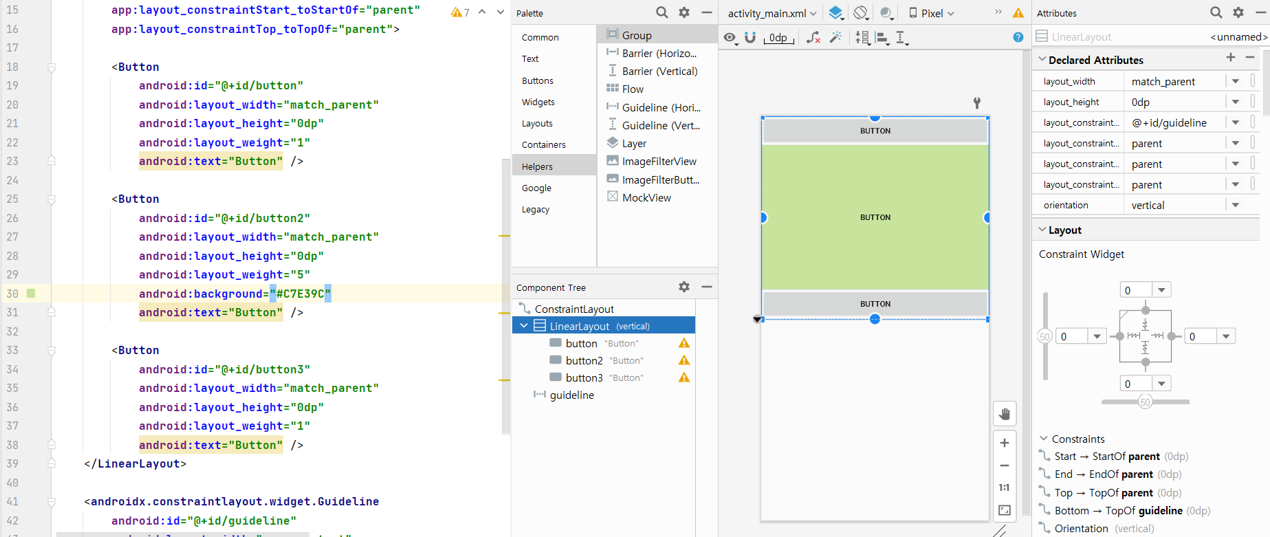 사실상 크기를 정한다기보다는 여유 공간을 분할해서 가져다 붙이는 느낌이긴 하지만, 그게 리니어 레이아웃만의 독특한 방법인 듯싶다.